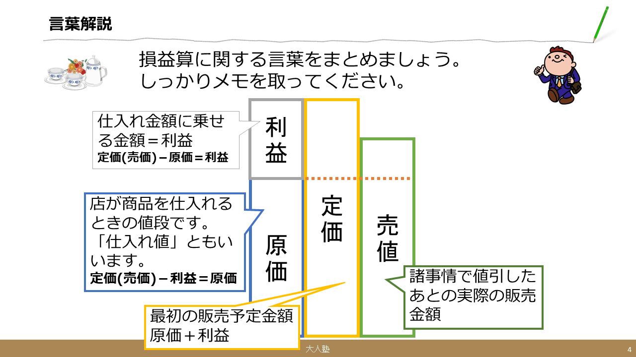損益算基礎 2026.03.18 スライドはスマホで見る場合スライドしていただくこともできますし、キーボードの左右のボタンを利用していただくこともできます。 大人のための数学教室大人塾の「損益算」講座の「損益算入門」スライドです。原価、定価、利益とか、混乱してしまう!という方は是非ご覧下さい。