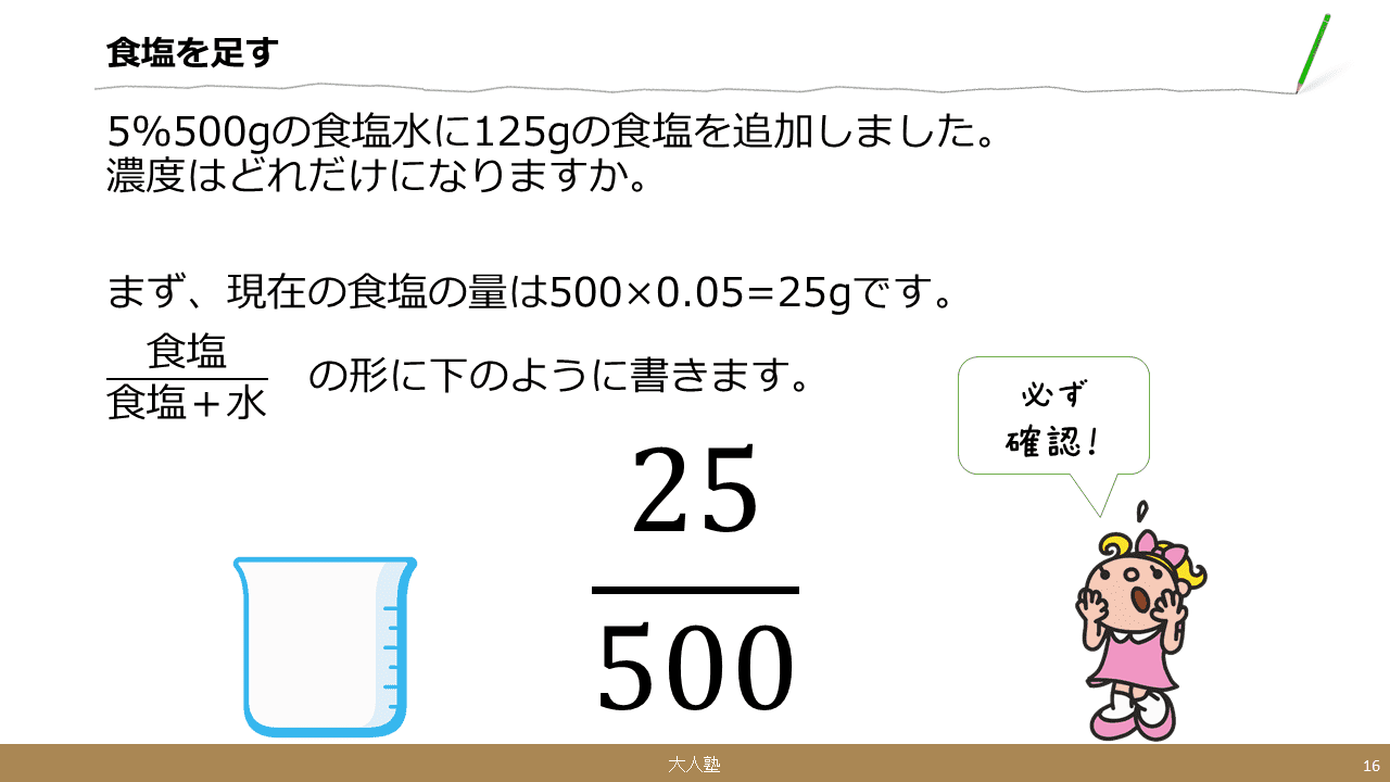 注意点として、分母のもとの塩水の量に、追加した塩の量と同じ量を足す必要があります。塩を加えると、塩水全体の量(分母)も増えるためです。